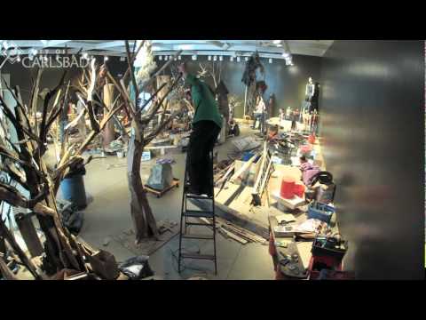 Just like happened in Bakersfield, the Gardeners fell in love with Carlsbad and the people and community...lots of good Mexican food, and the old fashioned old school SOCAL surf culture made a nice mix. One goal of ours on this turn was to break down the barrier between the "artist" and the Museum pros, so, early on, I invited the director, curator, etc. to wear their work clothes anytime they wanted and come create with us. I also reached out to the local schools and grabbed a couple of aspiring artists, after assuring them that we weren't as scary as we looked. Finally, we enfolded a couple local established artists into our group. So, two things were accomplished, the integration of the Museum pros in the process, and the outreach to the local community, always a part of the Gardeners' Master Plan. As usual, the initial messy phase of noise, piles of junk, and improvisational panic was, well, messy. The director only looked like she wanted to run down to Mexico a couple times. Many Gardener heroes in this project, but new Gardeners 'lexi Boeger and BenVa St. Morris did wonders with yarn and weird other materials in making a giant spider web on to longtime Garden Star Sam Dantone's famous cardboard tree. Sam's wooden pallet trees are amazing as well. Gardeners Dan Brubaker and Holden Crane pulled off a dramatic maneuver in the last hours of the installation by stacking a bunch of closet doors together in to a couple of 14 foot columns...the verticality of these columns dramatically improved the entire installation.